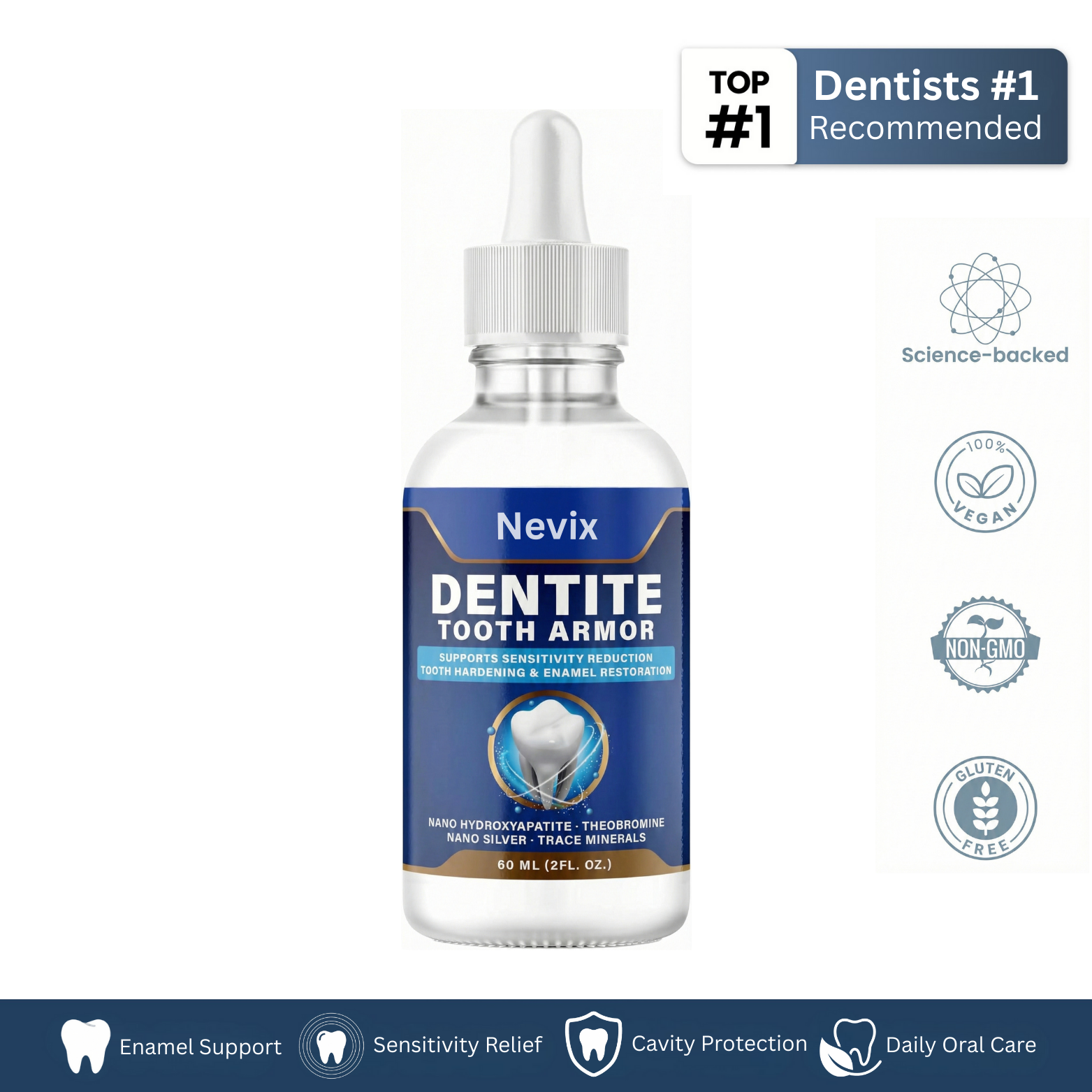 Nevix Dentite Tooth Armor is made with gentle, high-quality ingredients designed to support enamel strength, reduce sensitivity, and protect teeth for daily oral care.