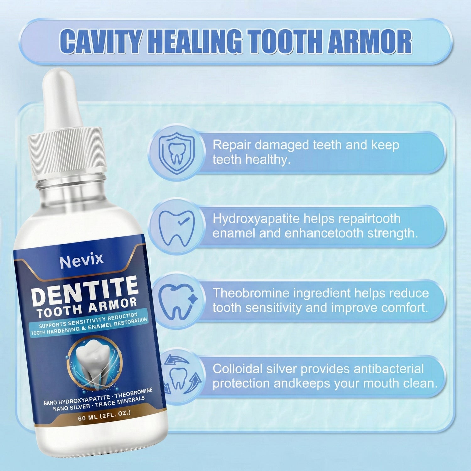 Protect your teeth before damage adds up. Nevix Dentite Tooth Armor supports enamel strength and sensitivity relief against everyday stressors like acidic foods, temperature changes, and plaque buildup. Powered by nano-hydroxyapatite and theobromine, it helps create a protective enamel barrier with daily use—supporting long-term oral health in a simple, at-home routine.